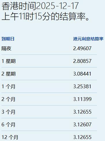 智通财经APP获悉,12月17日,港元拆息全线向上,而与楼按相关的一个月拆息连升两日报3.25381%,升12.625基点;反映银行资金成本的三个月拆息报3.12655%股票配资查询论坛,升3.697基点。